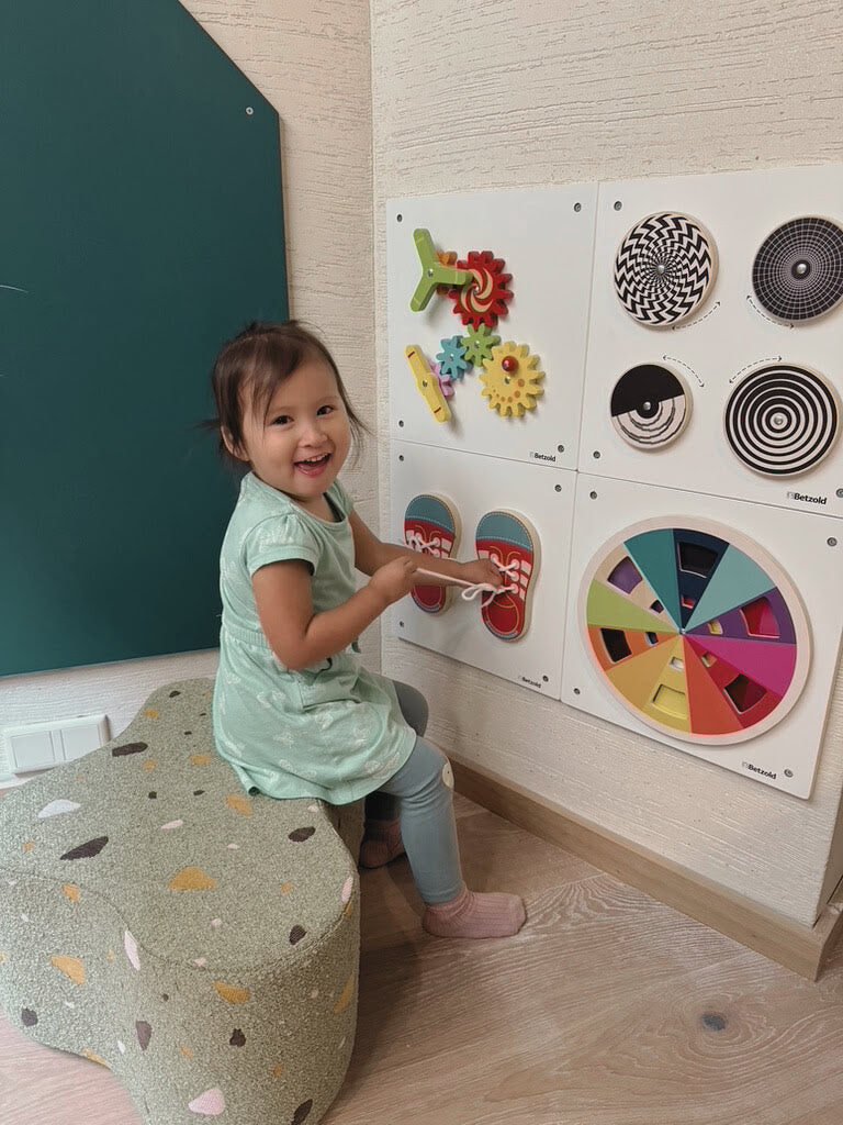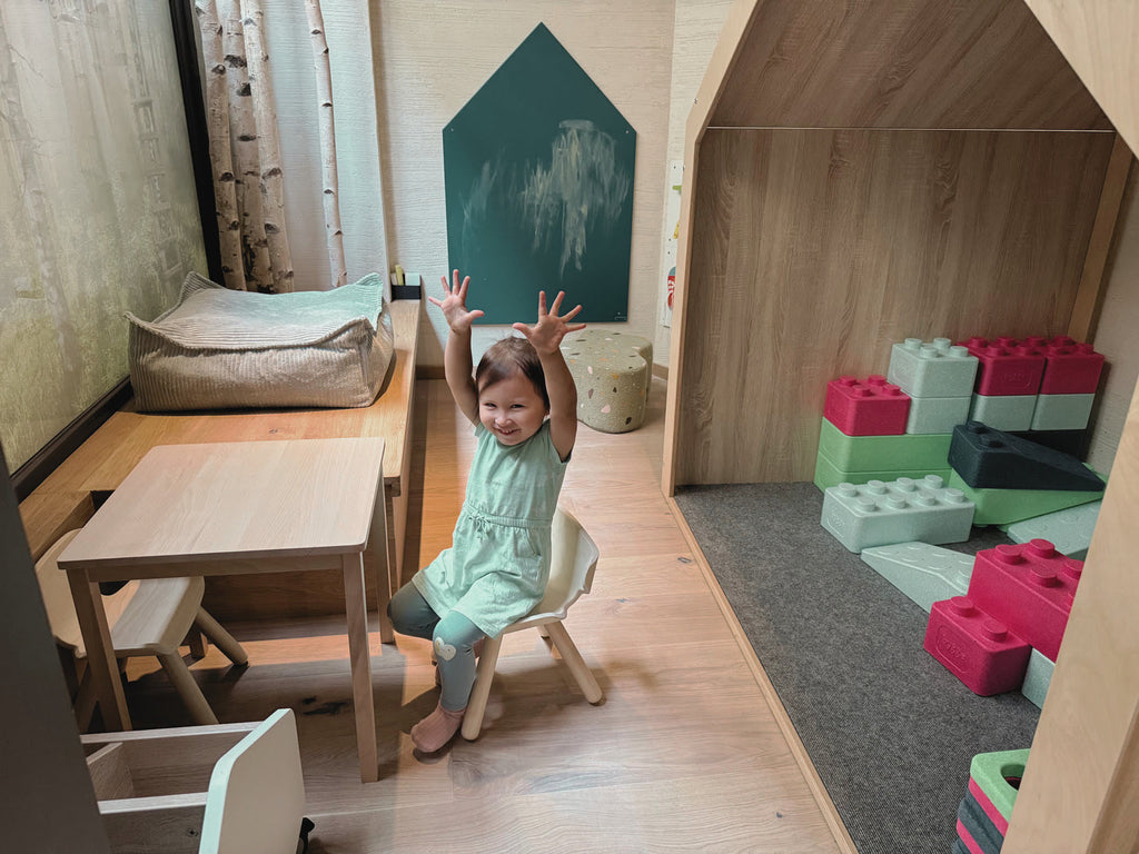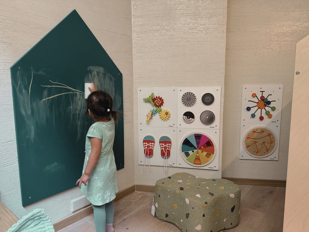 The new play corner in the restaurant is lovingly designed and offers a variety of activities: a playhouse with large foam building blocks invites kids to build and climb, motor skills panels encourage playful learning, and a large chalkboard wall inspires creative drawings. Comfortable seat cushions, tables, and chairs create a cozy atmosphere for painting and crafts. In addition, books and art supplies are available to keep little guests entertained again and again.